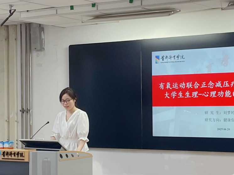 刘梦婷同学以“有氧运动联合正念减压疗法对高心理应激大学生心理-生理功能的干预效果研究”为题,介绍了有氧运动与正念减压疗法(MBSR)的结合方式及其应用方案,展示了该研究的背景、设计思路与具体实施流程。她详细阐述了如何通过科学设计的运动方案结合正念练习,来干预高心理应激大学生的身心状态。该研究紧密契合了当前大学生群体日益增长的心理健康需求,响应了加强学生心理健康服务的时代要求,为运动科学与心理学交叉融合干预心身健康问题提供了新的实证探索。这种结合身体活动与心理调适的干预方法具有显著的实用价值,其应用效果和推广潜力引发了广泛关注。