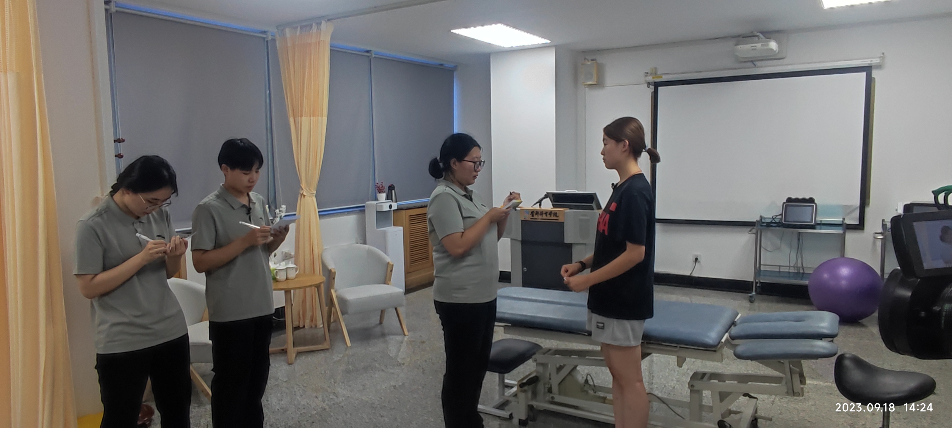 最后一个环节是进行肌肉骨骼康复的模拟演练,学院邀请到北京海思康运动医学诊所的尚学东主任担任评委并给予指导。本比赛环节要求每名参赛选手根据抽签确定的伤病资料,对“标准化”受伤模特进行肌肉骨骼与运动损伤评估、活动度与肌力训练演示,操作时间为8分钟。进行模拟的伤病包括肩袖损伤、“跑步膝”和“网球肘”。为了加强对学生的训练和更好地展示专业能力,我们在演练中增加了“制订治疗方案并口述”内容,这个方案事先得到了尚主任的肯定。他从一个运动医学临床医生的实践角度和担任上一届评委的经历逐个对参赛学生的表现给予了点评和指导,为大家梳理了规范的运动损伤评估、诊断(鉴别诊断)、康复治疗方案制订和实施流程,并教会了大家其中的技巧和重点加分项,让大家接受了一次临床实践培训。
