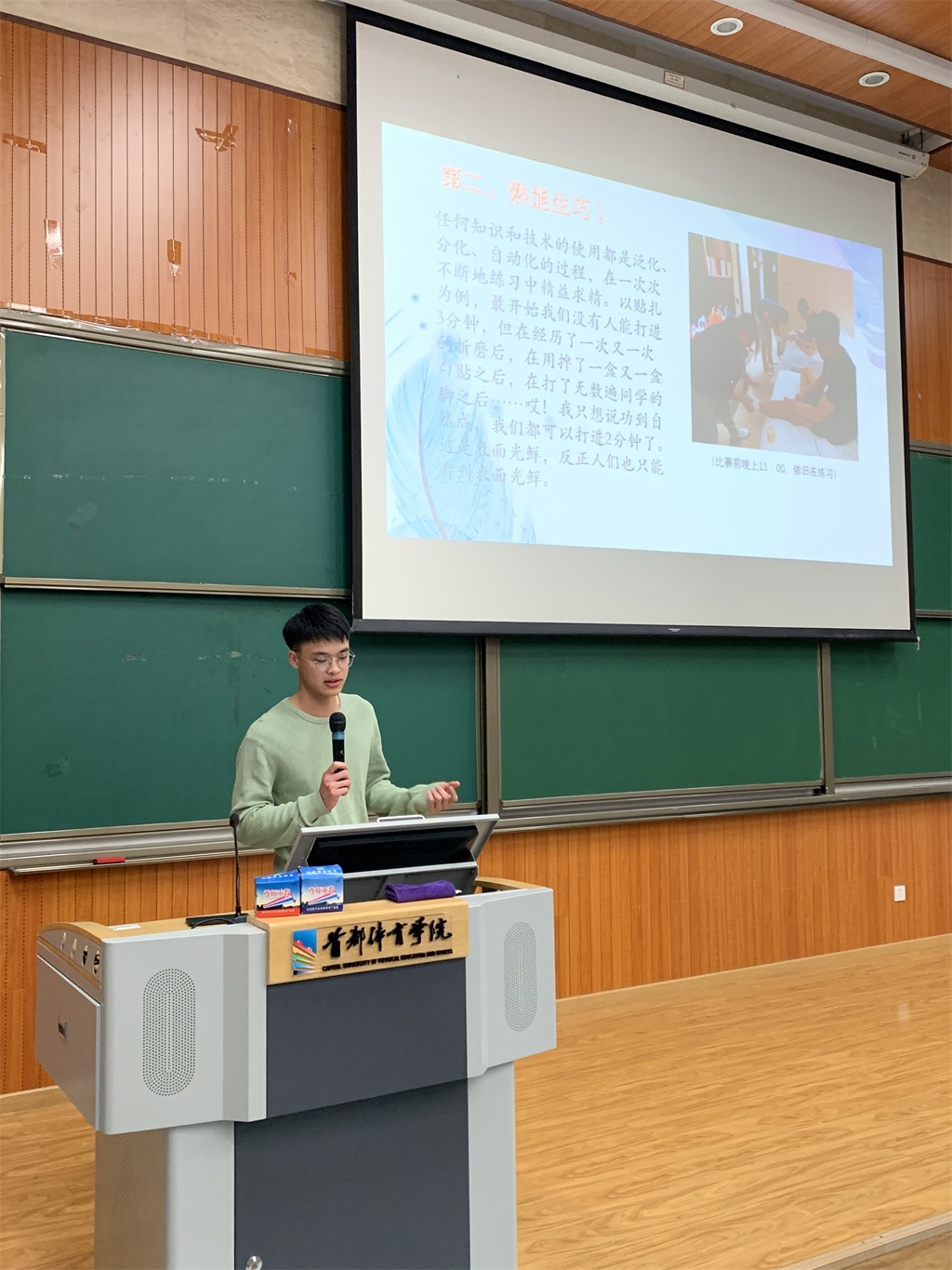 11月21日,全国运动康复专业技能大赛获奖学生优秀事迹分享会在三阶梯教室召开,李广鑫、封羽婷、马如逸、张宪秋等4名一等奖获奖者通过演讲的形式,向91大赛
