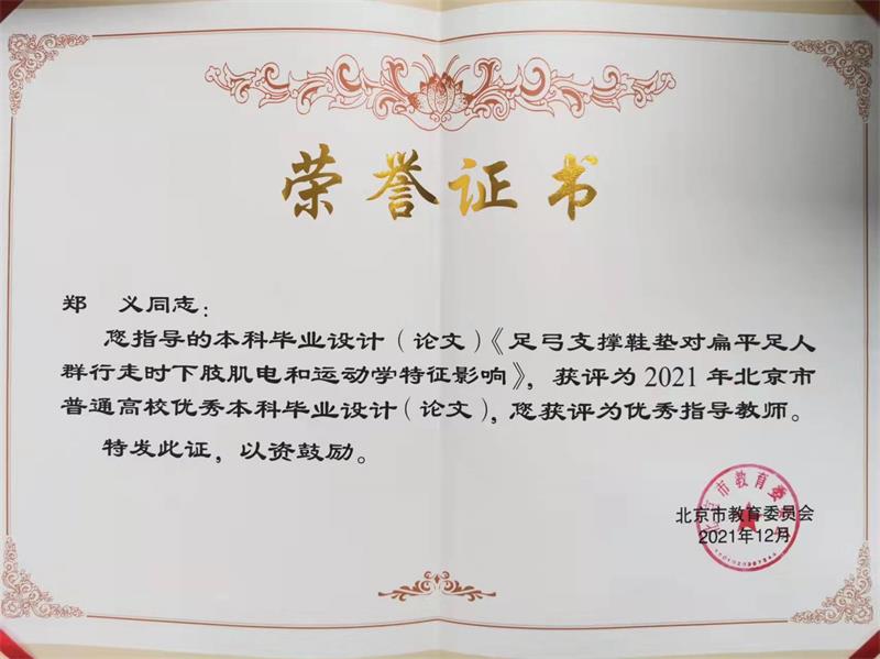 经过北京市教委评审,最终我院解剖生力教研室郑义老师指导的2021届运动人体科学专业本科生李佳祺的毕业论文《足弓支撑鞋垫对扁平足人群行走时下肢肌电和运动学特征影响》被评为“北京市普通高校优秀本科毕业论文”,郑义老师被评为“优秀指导教师”。