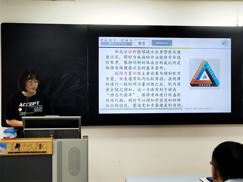 王红润同学汇报了项目《运动人体科学专业就业分析》,她通过重要课程和实习单位之间的对比以及目前健康问题备受关注的社会大背景,具体分析了运动人体科学专业在当前社会环境下可以从事的工作情况。