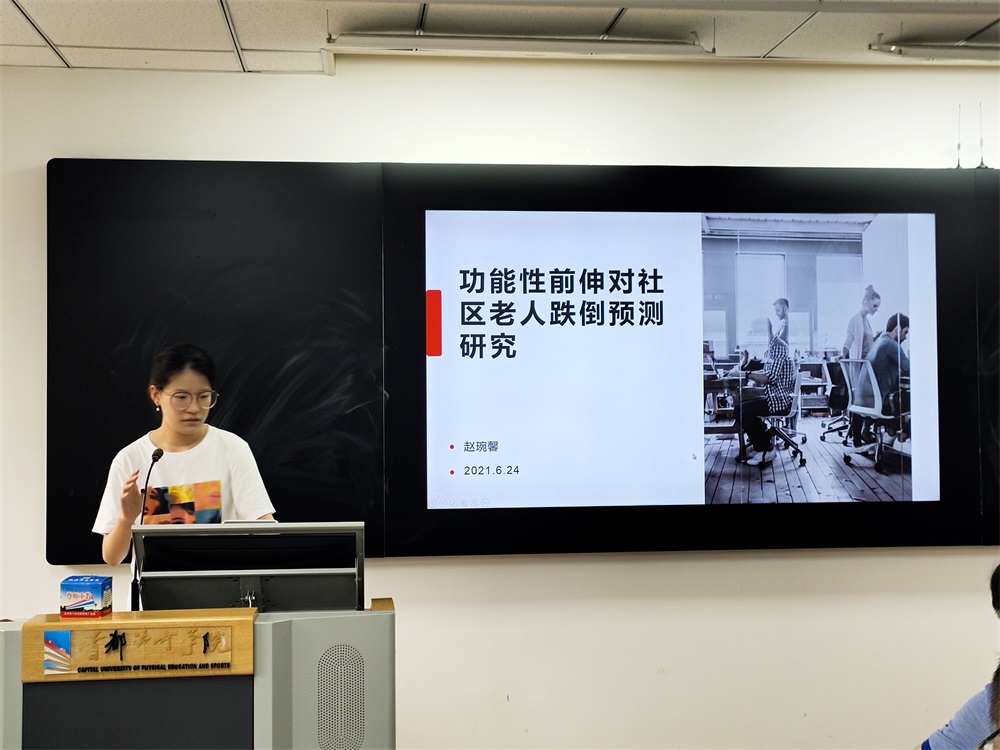 赵琬馨同学汇报了项目《功能性前伸对社区老人跌倒预测研究》的研究结果,该项目针对社区老年人患者常见的问题之一——平衡功能障碍,通过功能性前伸测试(FRT)开展对社区老年人平衡功能的测试和干预,探讨了FRT对于跌倒风险进行预测的价值。