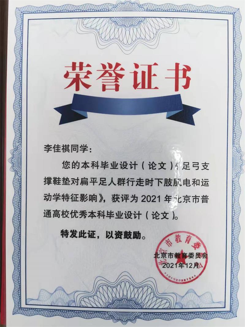 经过北京市教委评审,最终我院解剖生力教研室郑义老师指导的2021届运动人体科学专业本科生李佳祺的毕业论文《足弓支撑鞋垫对扁平足人群行走时下肢肌电和运动学特征影响》被评为“北京市普通高校优秀本科毕业论文”,郑义老师被评为“优秀指导教师”。
