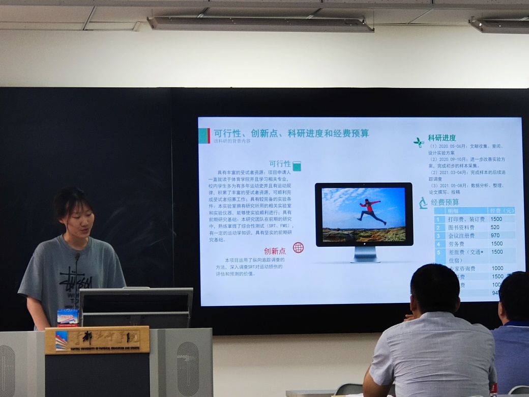 毕畅同学汇报了《基于FMS和SRT测试对大学生运动性损伤的预测评估》实验成果,该实验通过开展FMS测试和SRT测试对身体各方面指标进行评价及研究,为解决大学生参加体育运动时如何避免可能发生的损伤提供参考。