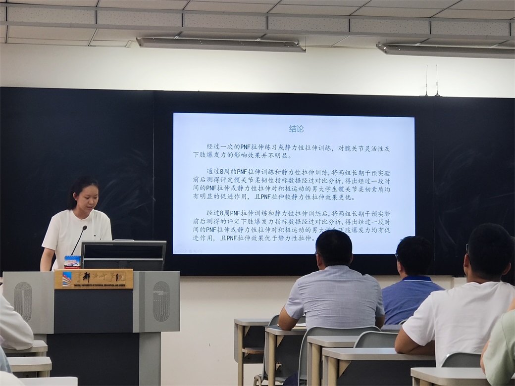 论坛现场报告由第一位同学于卓文拉开帷幕,她汇报了本人的研究课题《PNF技术于静力性拉伸对发展大学生髋关节柔韧性和下肢肌肉爆发力的对比研究》,该课题基于近二十年来本体感觉神经肌肉促进技术(PNF)的发展,通过激活骨骼肌中的本体感受器的方式,调动病人的意识对相应软组织进行松解,并得出结论:PNF实验对积极运动的男大学生髋关节柔韧素质有更优的促进作用,对积极运动的男大学生下肢爆发力也有更优的促进效果。
