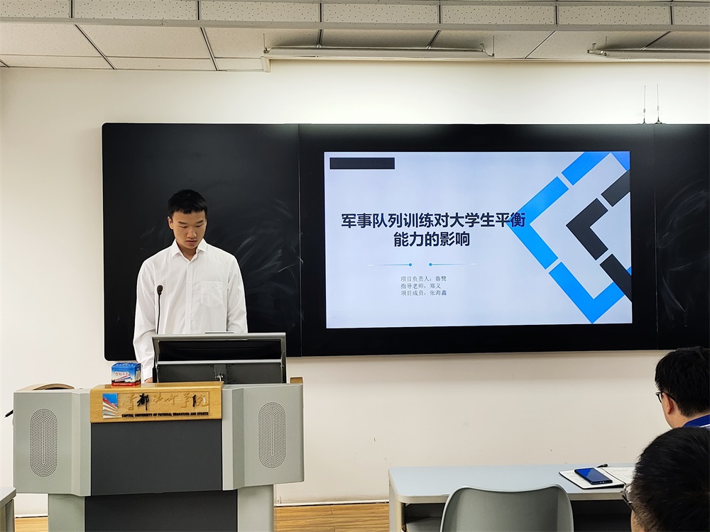 张海鑫同学汇报的课题项目《军事训练对大学生平衡能力的影响》,通过对照实验发现,军事队列训练对人体的静态平衡能力和动态平衡能力均有促进作用,不仅能使人体的上下肢及躯干动作协调统一,还能纠正含胸驼背等不良姿态,提高身体的控制能力。