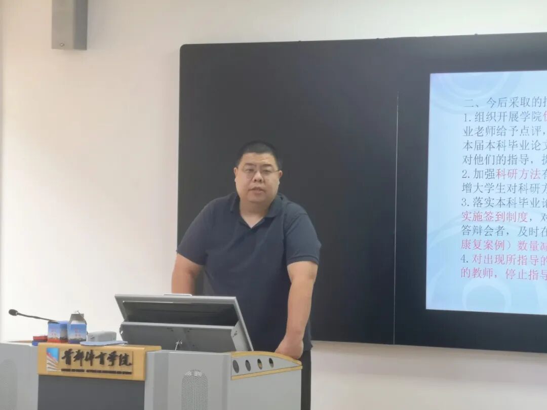 为落实“三全育人”要求,强化本科毕业论文规范化管理、提升论文质量,5月30日下午,运动科学与健康学院组织召开“提升本科论文质量”专题工作会暨2025届本科毕业论文工作总结会。学院领导班子成员、各教研室主任及2025届本科毕业论文(运动康复案例)指导教师参会。